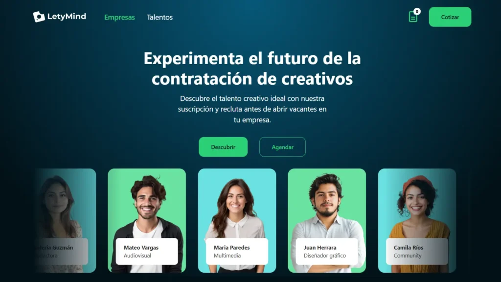 LetyMind requería una experiencia que combinara sitio de marca con cotización self-service para empresas y un módulo de Talentos para atraer postulantes. Objetivo: reducir fricción en la fase de descubrimiento, estandarizar precios por paquete de horas y canalizar cada cotización o postulación hacia un flujo operativo trazable.